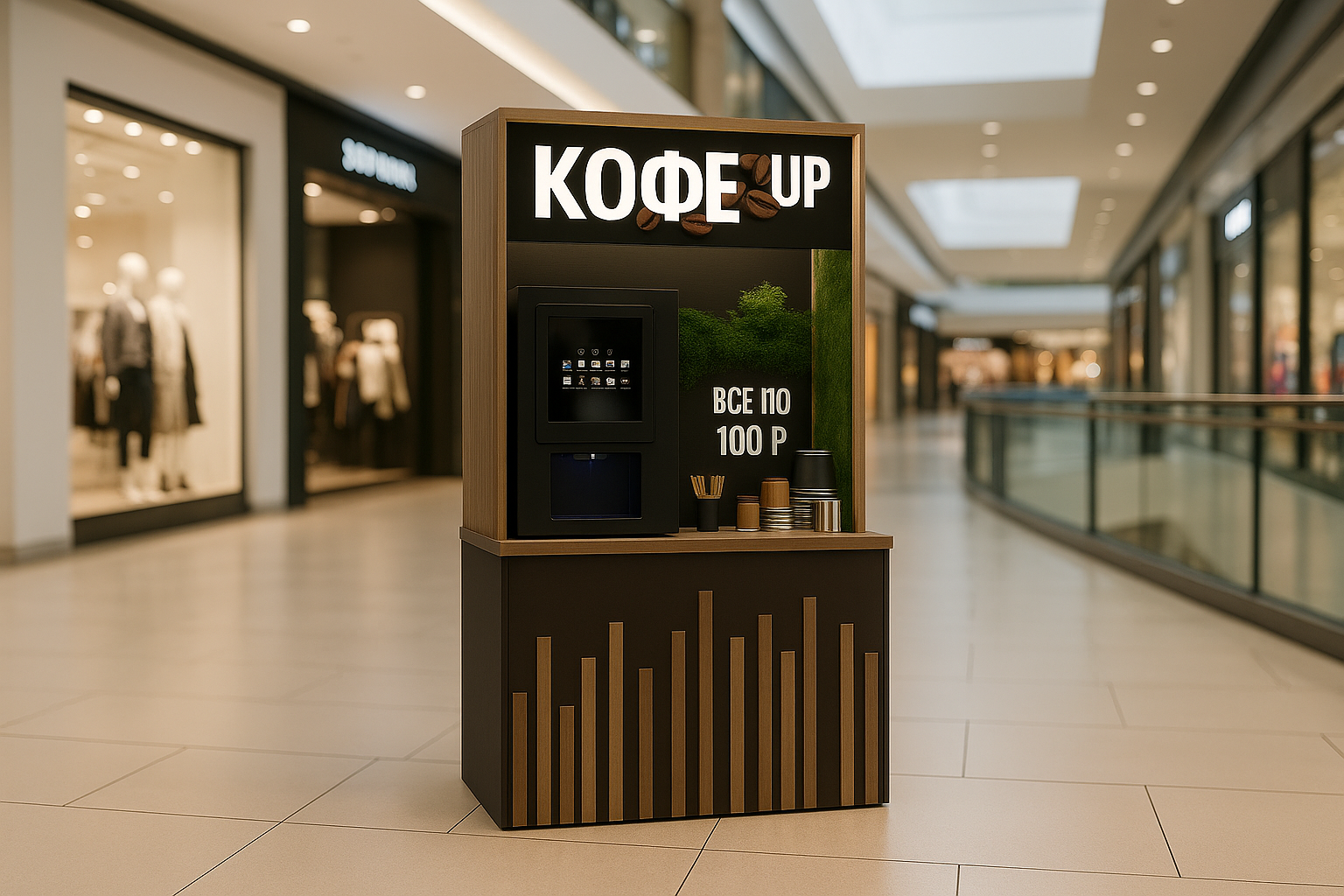 Это автоматизированная точка продажи кофе с компактной стойкой и профессиональной кофемашиной