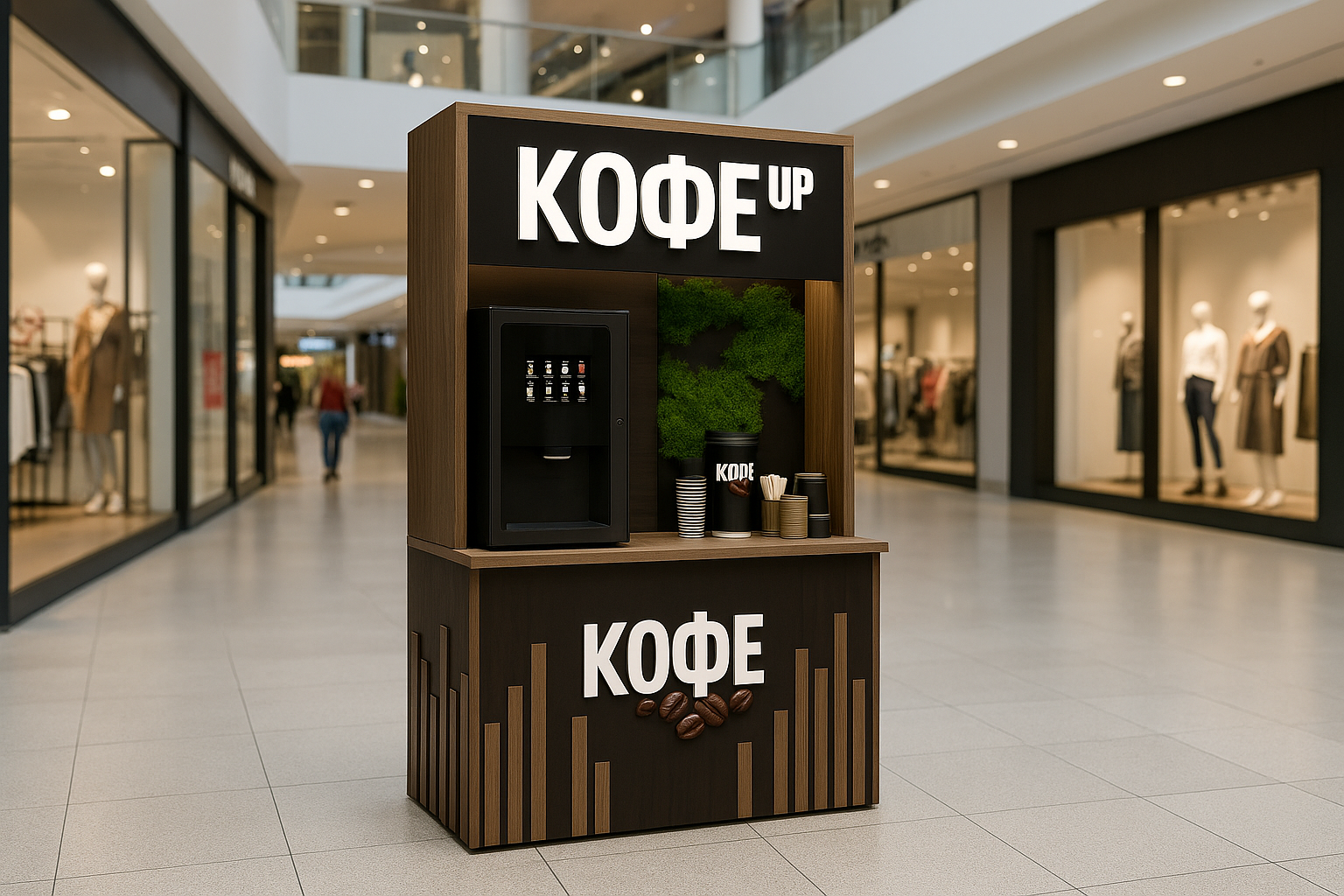 Это автоматизированная точка продажи кофе с компактной стойкой и профессиональной кофемашиной